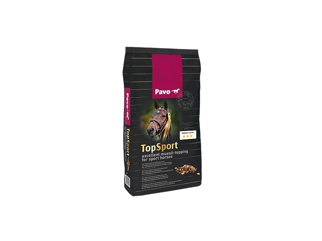 Pavo Top Sport je špičkové výkonnostní müsli pro podporu tvorby svalů a udržení sportovní kondice. S vysokým podílem esenciálních aminokyselin, extra vitamín E a selen pro lepší funkci svalů. Vysoký podíl proteinů. Balení: 15kg.
